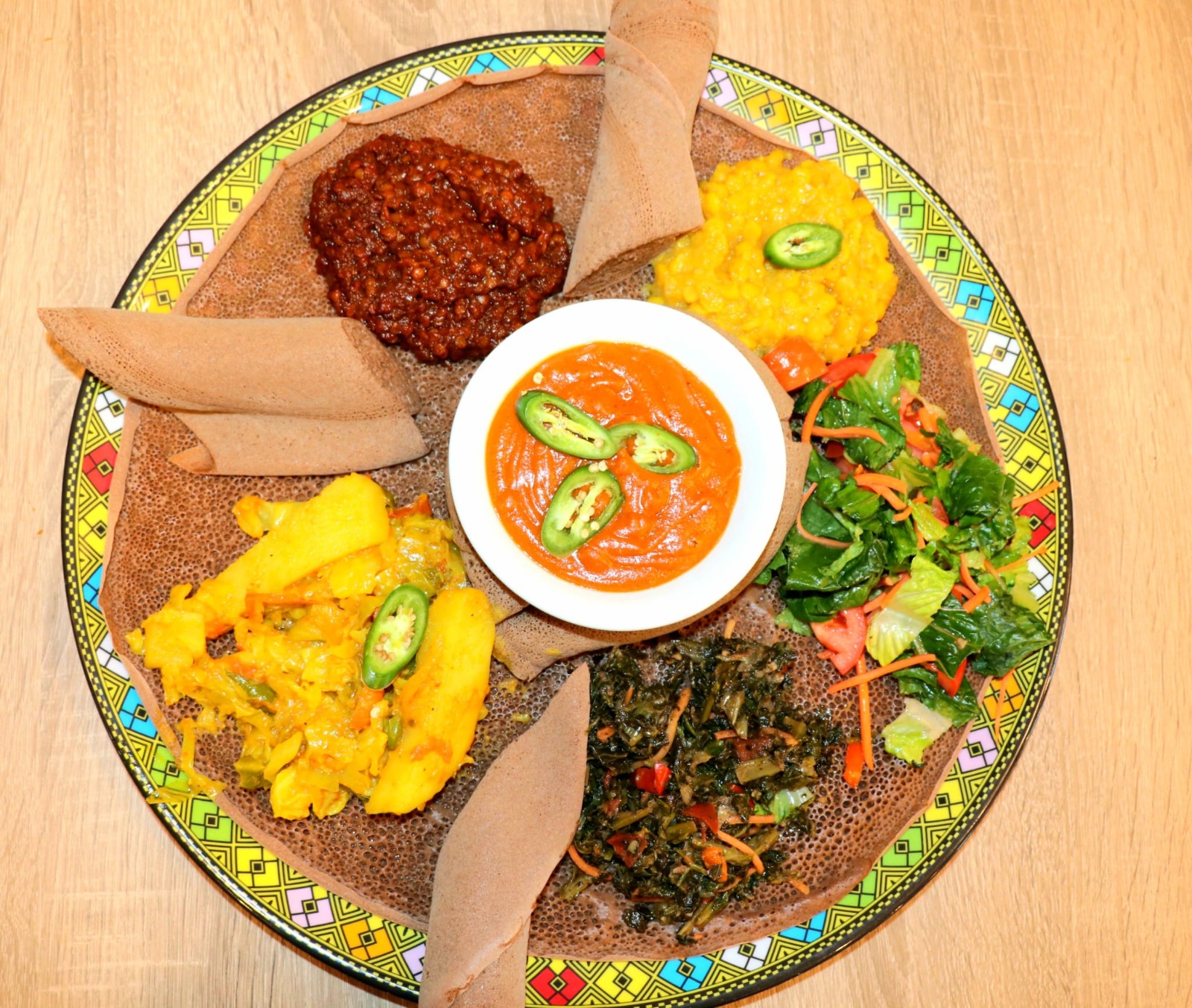 A choices of 5 dishes and all stew are served with fresh injera (Ethiopian flat bread), or optional turmeric spiced rice