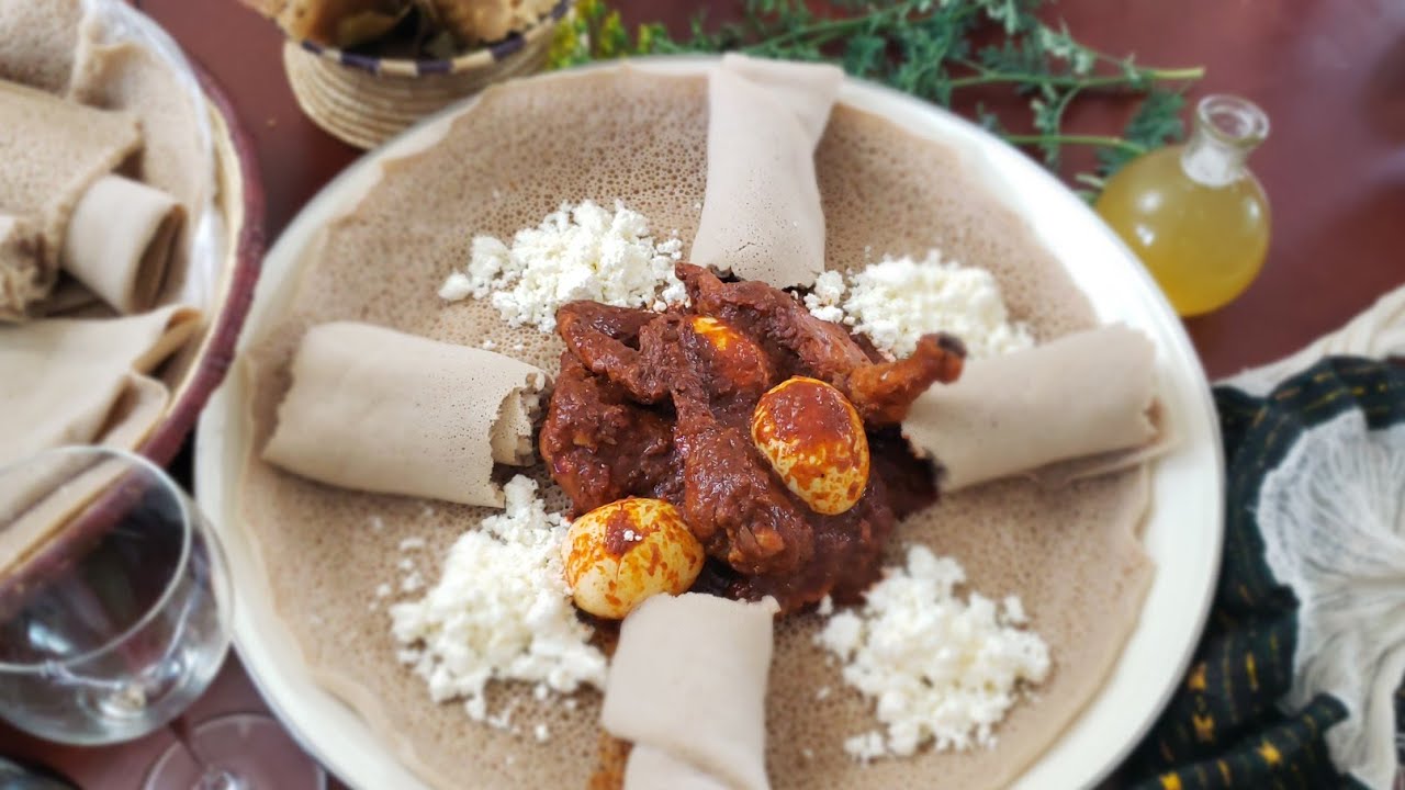 A national favorite dish of Ethiopia, marinated chicken stew cooked with a mild spiced (berbere) onion, garlic, cardamom, tomato-based sauce, served with a hard-boiled egg and chicken drum