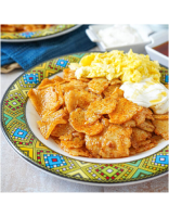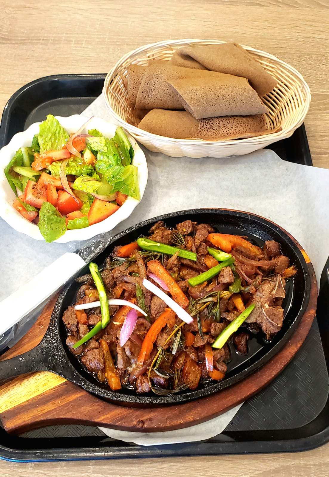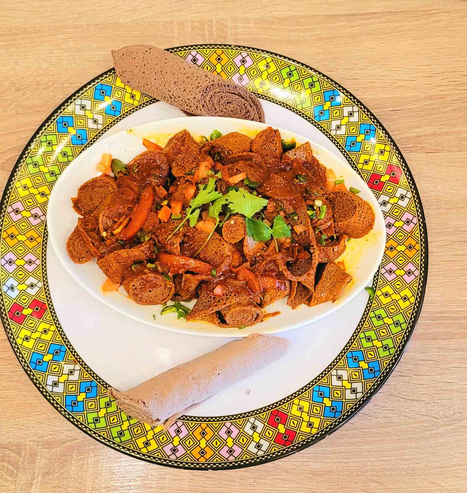 Delicious Ethiopian dish that combines savory tibs(spicy sautéed meat) with crumbled injera bread.