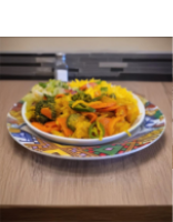 A slow-cooked lamb with turmeric, onion, garlic ginger, potatoes and carrot.