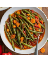 Fresh green beans and carrot saute together with onions, garlic, and fresh mild chilies. All stew are served with fresh injera (Ethiopian flat bread), or optional turmeric spiced rice